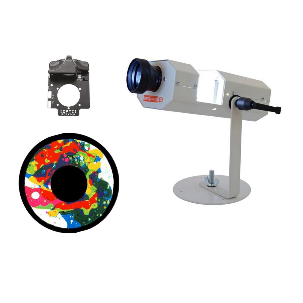 Táto sada pozostáva zo 100 LED projektora, magnetického motorčeka a magnetického kolesa s primárnymi farbami. Projektor je kompaktný a prenosný, čo ho robí ideálnym pre profesionálne zmyslové miestnosti, spálne či obývačky. Vďaka 20 Watt LED osvetleniu poskytuje jasné a farebné projekcie s nízkou produkciou tepla, nízkou hlučnosťou a prakticky bezúdržbovou prevádzkou. Projektor je úsporný a má nízku spotrebu energie. Obsahuje 85 mm šošovku pre ostré zobrazenie. Obsah balenia sa môže líšiť.