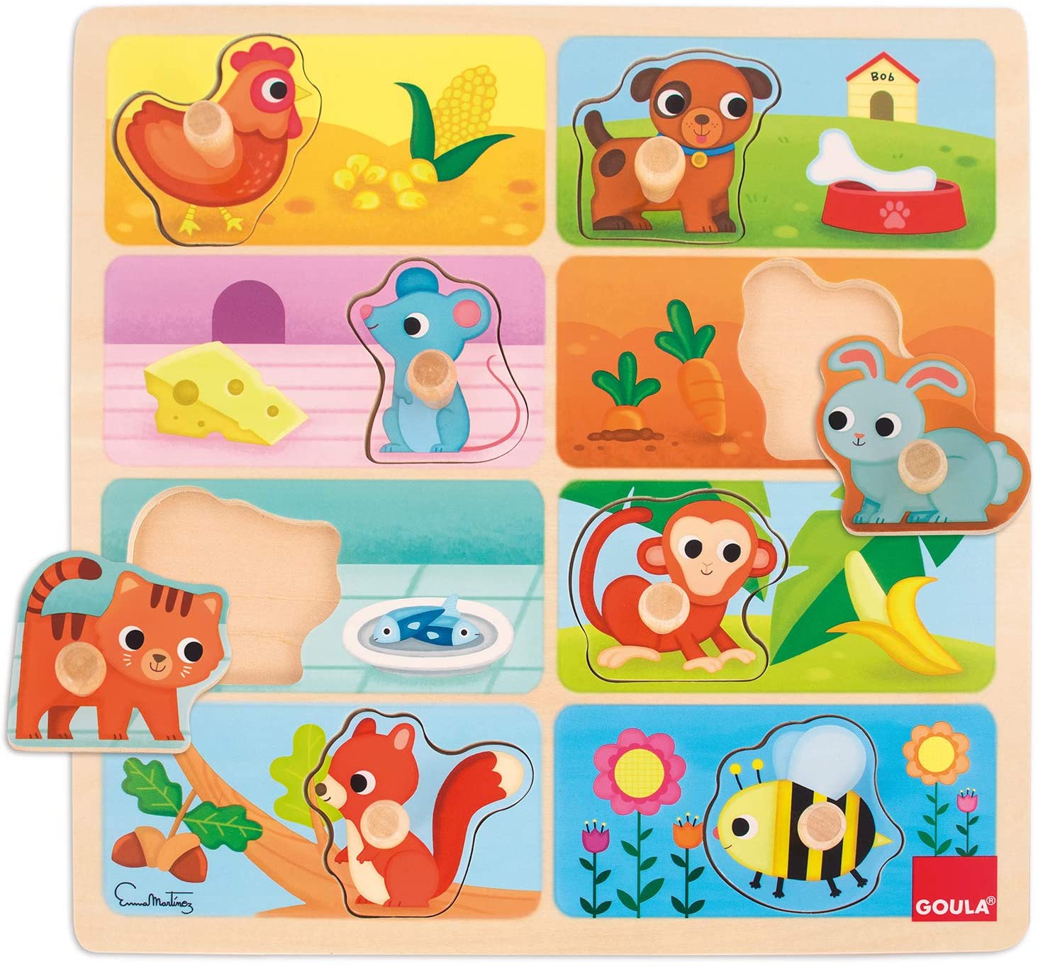 8 vkladačiek so zvieratkami a drevená podložka.