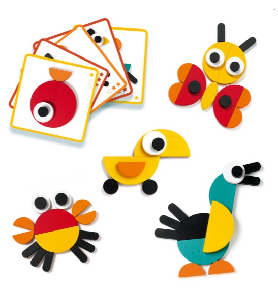Skladačka s 29 drevenými prvkami v podobe geometrických tvarov a 20 kariet s modelmi zvieratiek na skladanie (3 úrovne obtiažnosti). Skladaním zvieratiek podľa návodu sa dieťa učí rozpoznávať tvary a farby. Pomôcka precvičuje postreh, zrakovú pamäť a jemnú motoriku dlane.