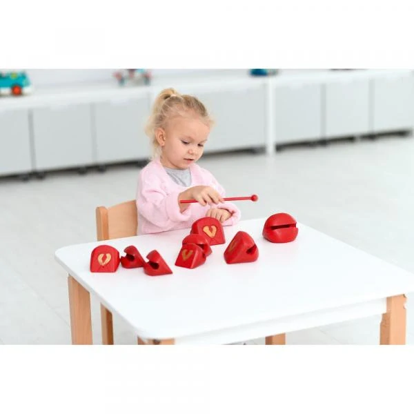 Drevené tonbloky v 4 rozmeroch, v súprave s paličkou s dĺžkou 17,5 cm, priemer guličky 1,8 cm.