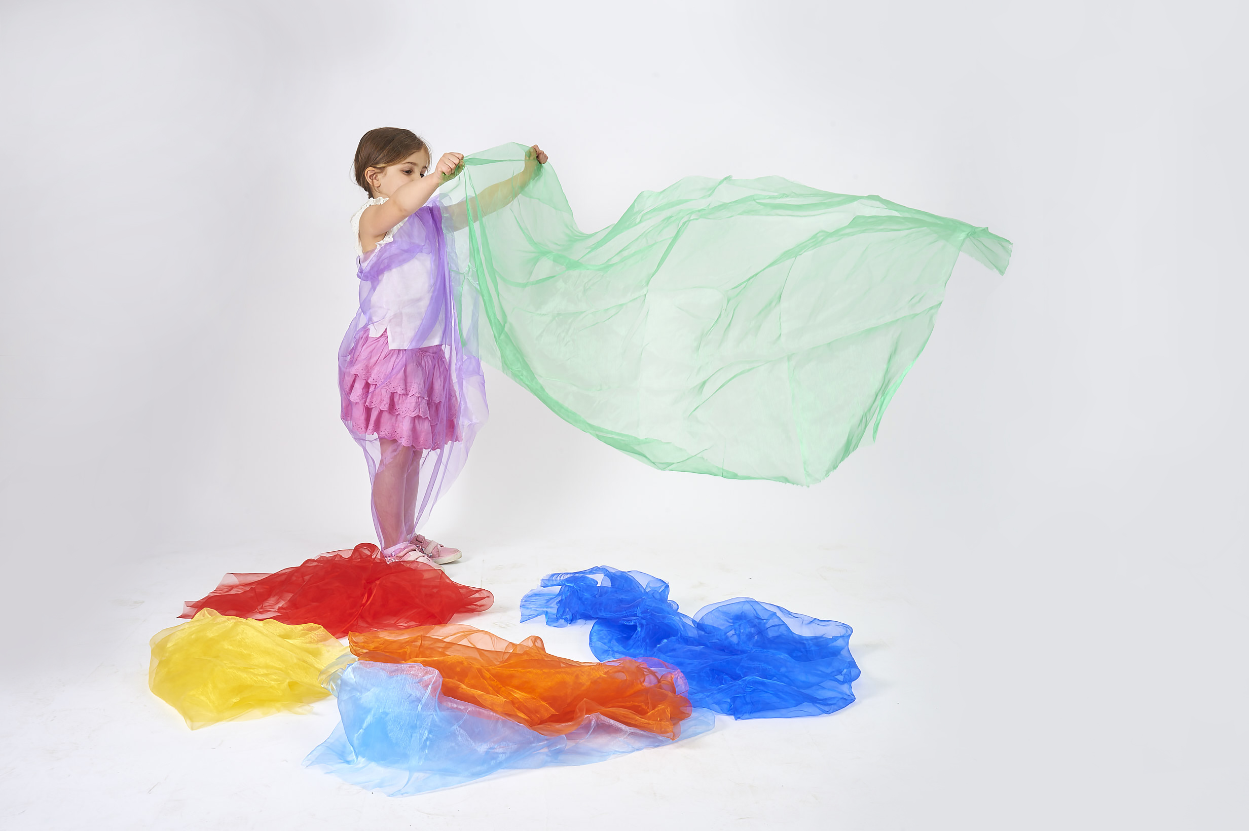 Dúhová organza je ľahká, jemne trblietavá látka, ktorá prináša do hry farby, pohyb a vizuálny zážitok. Vďaka svojmu priesvitnému efektu a žiarivým odtieňom dúhy vytvára magickú atmosféru, ktorá prirodzene podporuje kreativitu, predstavivosť a zmyslové vnímanie.