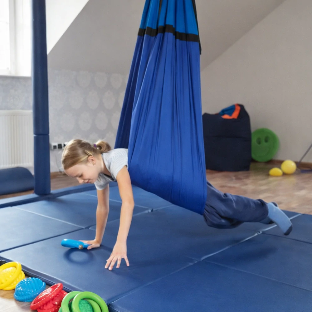 Elastická hojdačka je vyrobená z lycry v kombinácii s mäkkou bavlnou na dotyk, navyše vystužená čiernou páskou. Mäkká elastická tkanina poskytuje deťom hĺbkový tlak, ktorý napomáha k upokojeniu a lepšej sebaorganizácii. Objímacie hojdačky umožňujú neistým klientom zažívať pri hojdaní pocit istoty a bezpečia.
