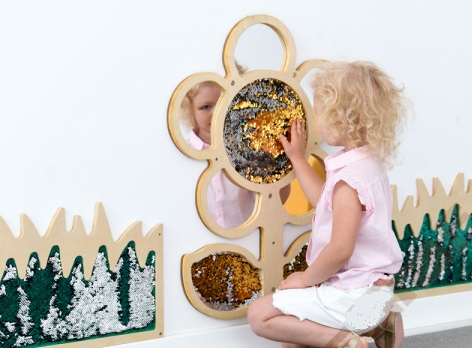 Farebné dekoračné zrkadlá priťahujú detskú pozornosť a nabádajú deti dotýkať sa povrchu pokrytého flitrami aj na prezeranie vlastnej tváre. Flitre sú magické, po pohladení sa ich farba mení. Kontakt s drsným povrchom flitrov je taktiež vhodným senzorickým cvičením.