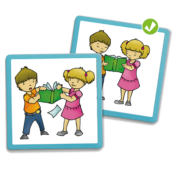 Asociačná hra, ktorá pripraví deti na príchod do školského kolektívu. Kartičky s kresbami zobrazujú vhodné a nevhodné správanie sa v škole. Úlohou detí je nájsť protikladné kartičky. Hra obsahuje 34 kariet a pedagogický návod. Rozmery kariet: 9 x 9 cm. Hrúbka: 2,5 mm.