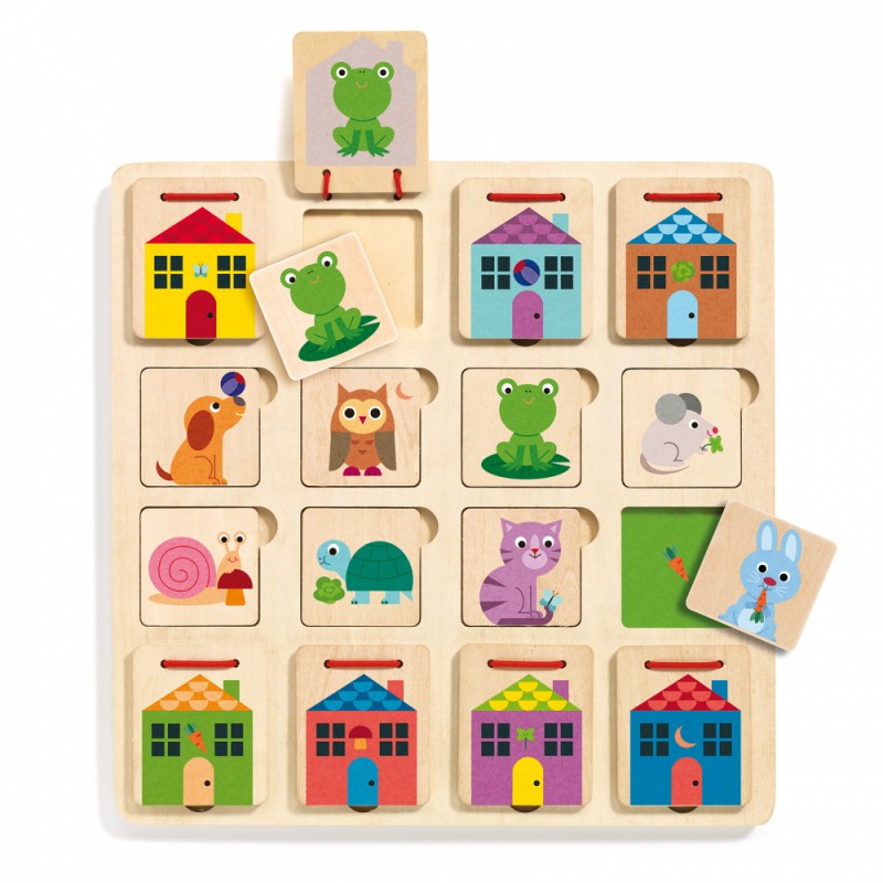 Za dvierkami sa skrývajú zvieratká. Úlohou hráča je určiť, ktoré zvieratko býva v domčeku. Pri dverách sa nachádzajú predmety, ktoré napovedajú. Hráči najskôr priradia predmety k jednotlivým zvieratkám a potom určia, ktoré kde býva