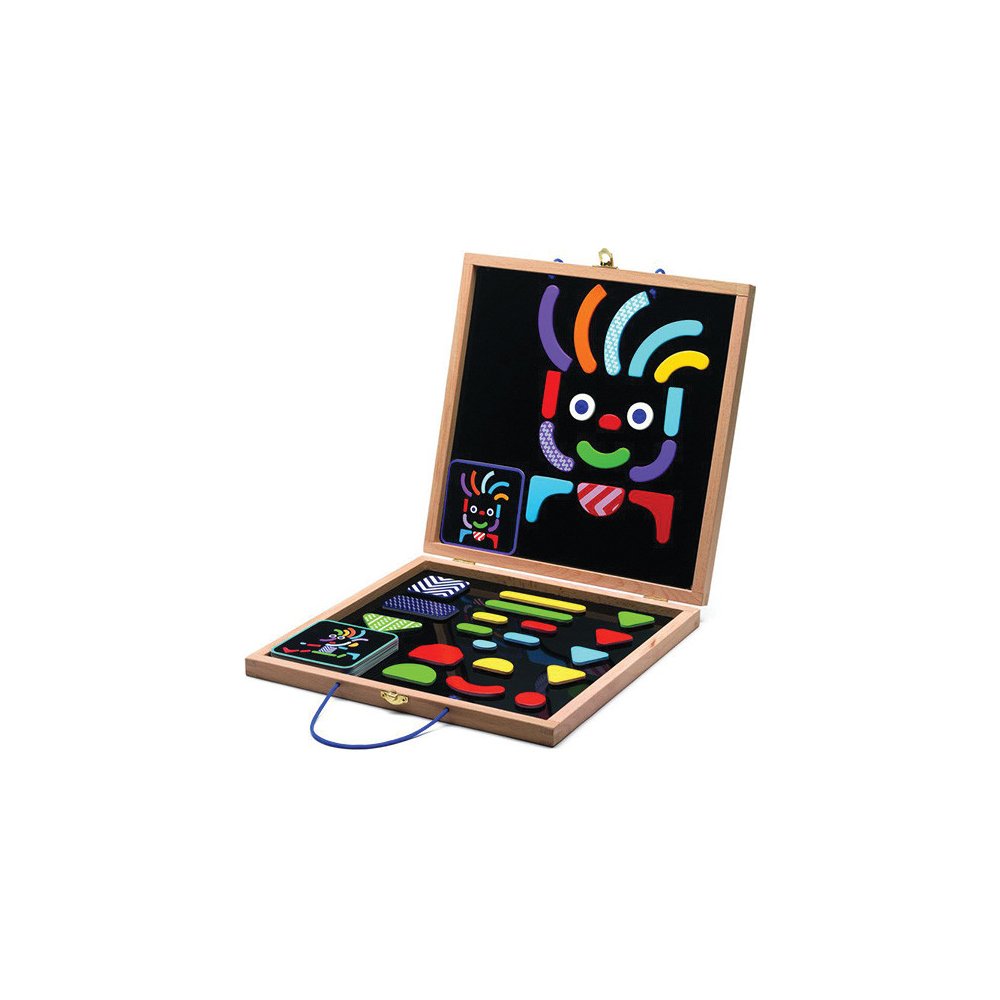 Stavebnice z dreva - farebné, geometrické prvky, z ktorých možno poskladať veľa zaujímavých obrazov, aj podľa predložených návrhov, ktoré môžete poukladať pomocou farebných magnetov. Všetko je uzavreté v drevenom kufríku s magnetickou tabuľou. Vzdelávacie hračky, ktoré deti učia geometrickým tvarom, stimulujú predstavivosť a tvorivosť.