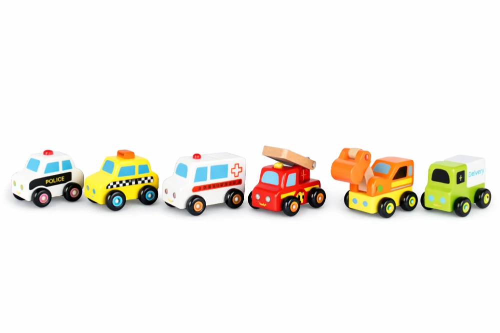 Súčasťou sady sú obľúbené vozidlá z detského sveta – taxi, policajné auto, hasičské auto, sanitka, nákladné auto a buldozér. Hasičské auto a buldozér majú navyše pohyblivé prvky (rebrík a lyžicu), ktoré podporujú detskú fantáziu, jemnú motoriku a koordináciu rúk.