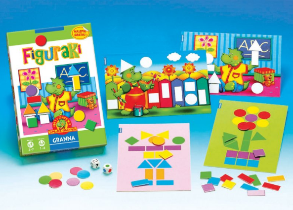 Pomôcka pre rozpoznávanie geometrických tvarov: kruh, štvorec, trojuholník a obdĺžnik. Tvary sa na obrázkoch objavujú v šiestich farbách. Hra obsahuje 2 hracie kocky. Pre 1-4 hráčov