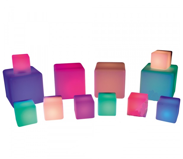 Sada podsvietených kociek dvoch veľkostí . Po otočení mení farbu. Deti radi kocky otáčajú v dlaniach a hádajú, aká ďalšia farba sa objaví. Sadu je možné doplniť ďalšími kockami (napr. priehľadnými) a stavať tak zaujímavé konštrukcie. Vyrobené z plastu.