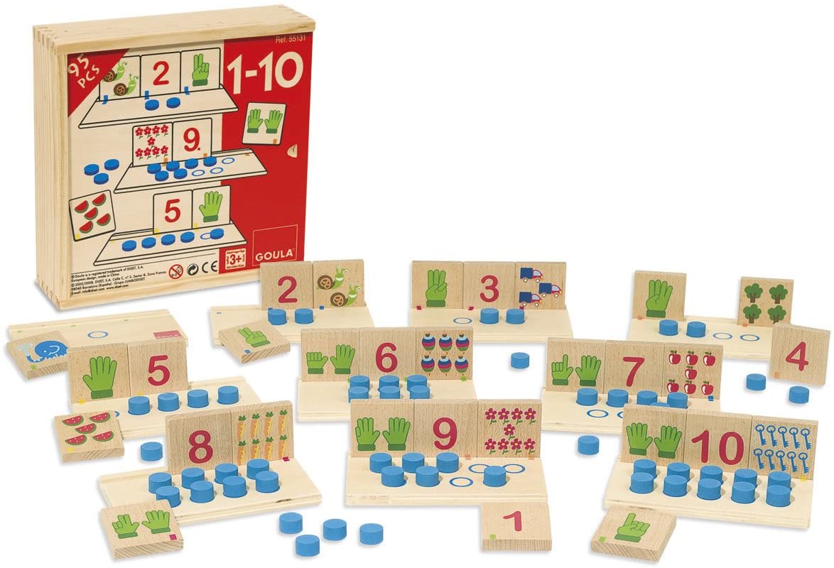 Sada drevených prvkov v drevenej krabičke s rozm. 22,5 x 22,5 x 6,5 cm, 10 základní pre umiestnenie obrázkov a žetónov, 10 tabuliek s dlaňami, 10 tabuliek s číslicami, 10 tabuliek s predmetmi. Pomôcka pre počítanie do 10 a vysvetlenie pojmu množín