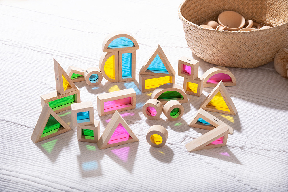 Naša sada Dúhových drevených blokov obsahuje 24 blokov z prírodného gumového dreva vo 6 rôznych tvaroch a s 4 rôznymi transparentnými farebnými vložkami z akrýlu. Tieto bloky sú určené na stavanie, porovnávanie, rozpoznávanie tvarov, miešanie farieb a sú vhodné aj na použitie na svetelnej doske.