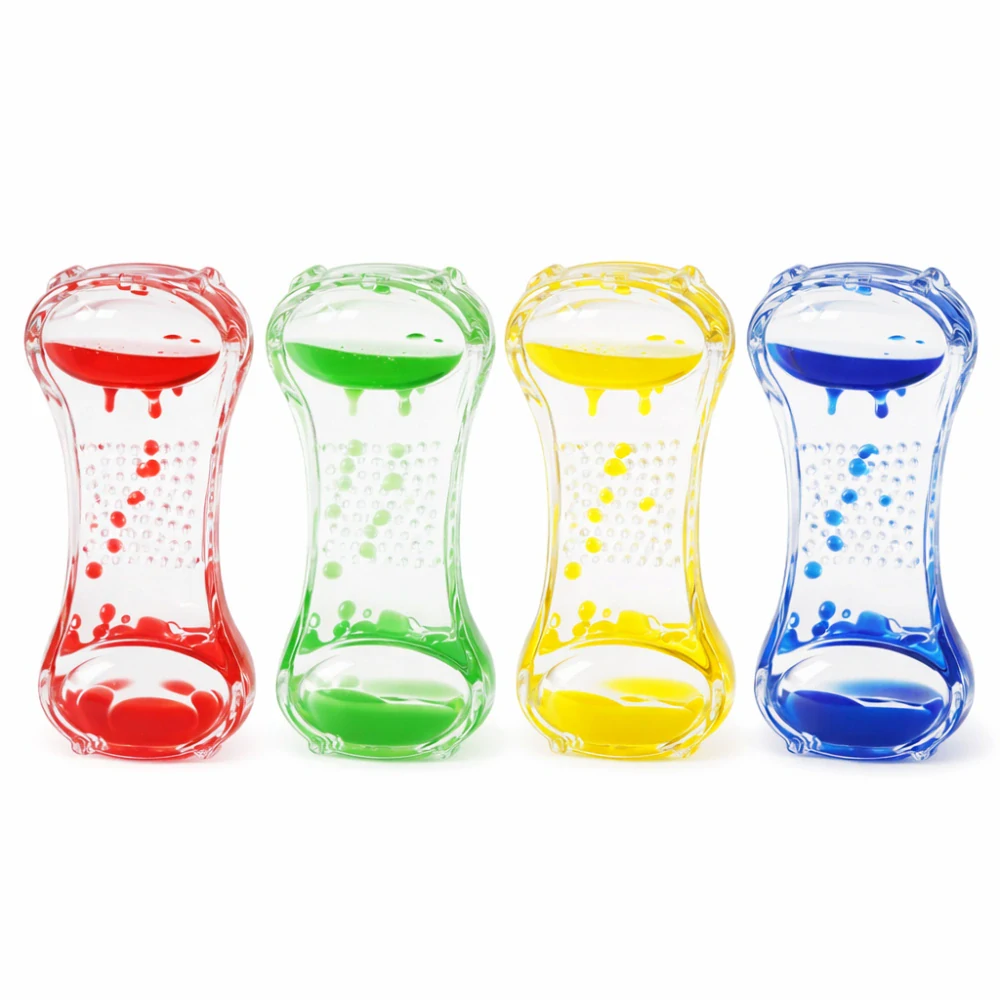 Priehľadné presýpacie hodiny s olejovou náplňou. Po otočení sa kvapky spájajú v spodnej časti.