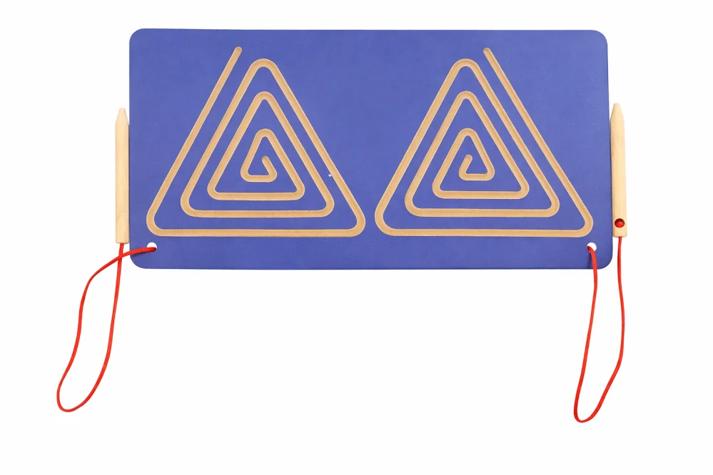Tabuľka na cvičenie oboch rúk – trojuholníky je edukačná pomôcka určená na rozvoj jemnej motoriky, koordinácie ruka-oko a prípravu na písanie. Vďaka zrkadlovo usporiadaným tvarom umožňuje deťom trénovať pohyb oboch rúk súčasne.