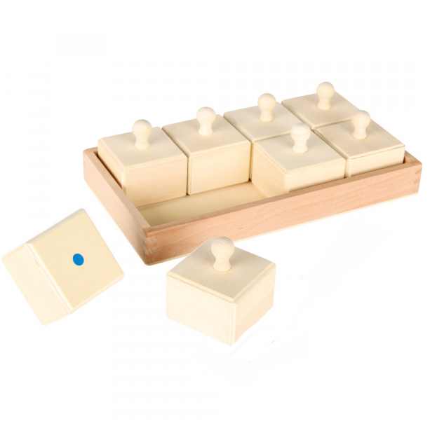 Drevené krabičky s úchytmi vydávajú rôzne zvuky. Deti hľadajú páry vydávajúce rovnaký zvuk.