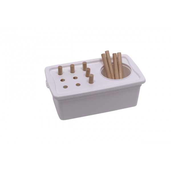 Vyberte drevené palice z nádoby a vložte ich do otvorov. Táto úloha podporuje rozvoj jemných motorických zručností.