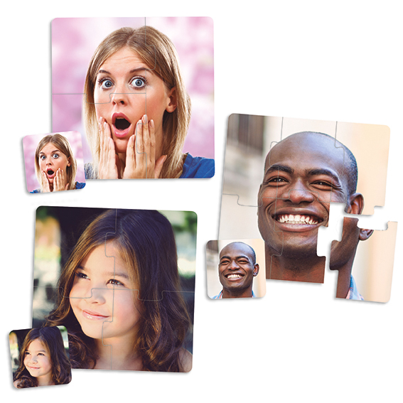 - Na 10 veľkých skladačkách sa nachádzajú fotografie detí a dospelých, ktorí prežívajú rôzne pocity. Skladačky sa skladajú z troch, štyroch alebo šiestich dielov. Deti skladačku jednoducho rozpoznajú a roztriedia, pretože zadná strana skladačky má inú farbu. Rozmery skladačky: 15,6 x 15,6 cm.
