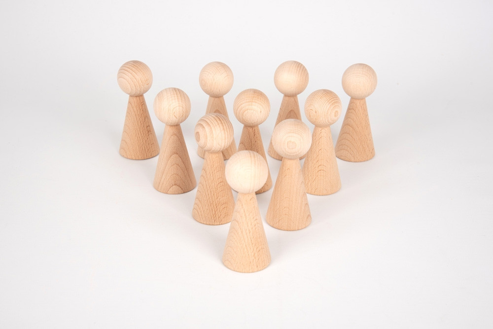 Sada drevených figúrok v neutrálnej prírodnej úprave je vhodná na voľnú hru, triedenie a vytváranie jednoduchých príbehov. Tvarom pripomínajú klasické „človeče“ figúrky, no sú väčšie a vyrobené z masívneho dreva.