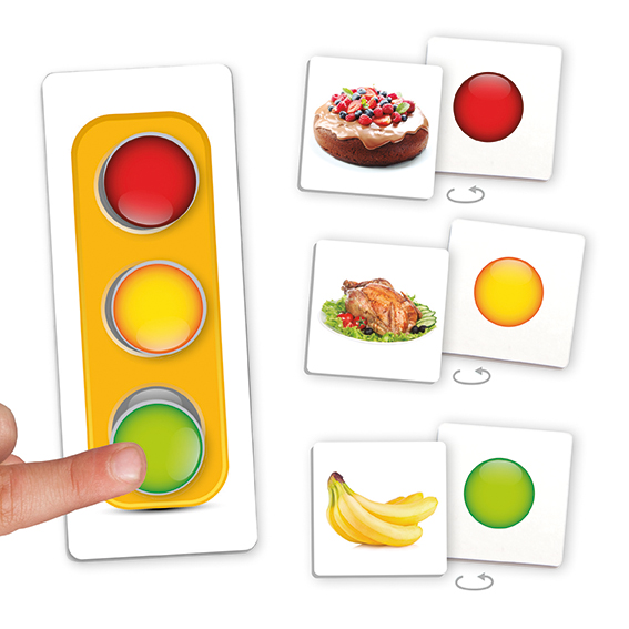 Asociačná hra, ktorá spája základné potraviny s farbami semafora podľa toho, ako často by sa mali jesť, kde zelená znamená často, oranžová niekedy a červená občas.