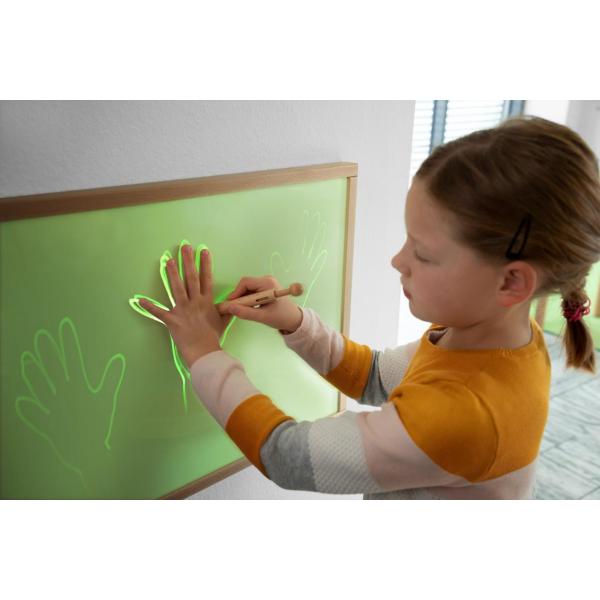 Obsah/materiál: Svetelný panel s rámom a perom z dreva. Fosforeskujúci film a nosný panel s doskou z akrylového skla (nie je odolný proti poškriabaniu). Svetelné pero je v súlade s LED triedou 1, nemalo by byť voľne prístupné deťom. V opačnom prípade hrozí oslnenie. Svetelné pero používajte iba pod dohľadom dospelej osoby.