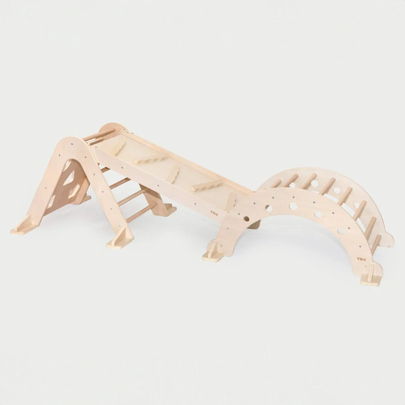 Táto všestranná trojdielna súprava obsahuje lezecký oblúk, lezeckú dosku a lezecký trojuholník. Jednotlivé časti sa dajú ľahko navzájom prepojiť, čím vznikajú rôzne kombinácie pre lezenie a pohybové aktivity. Deti tak môžu bezpečne preskúmavať svoje hranice, rozvíjať rovnováhu, koordináciu pohybov a zároveň napĺňať svoj prirodzený pud po lezení a objavovaní.