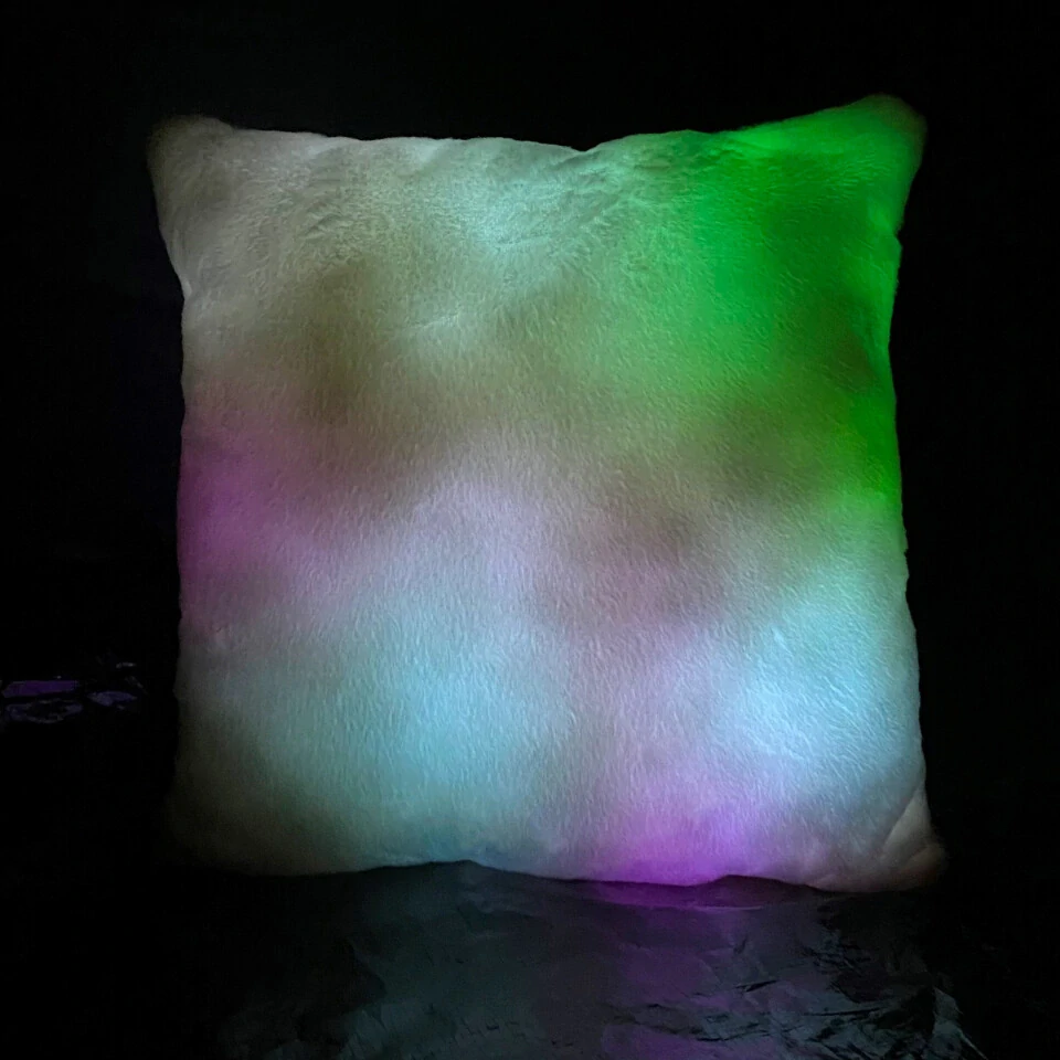 Zabudované LED osvetlenie: Vankúš obsahuje vnútorné svetielko, ktoré mení farby a jemne presvitá cez plyšový povrch, čím vytvára očarujúci efekt.