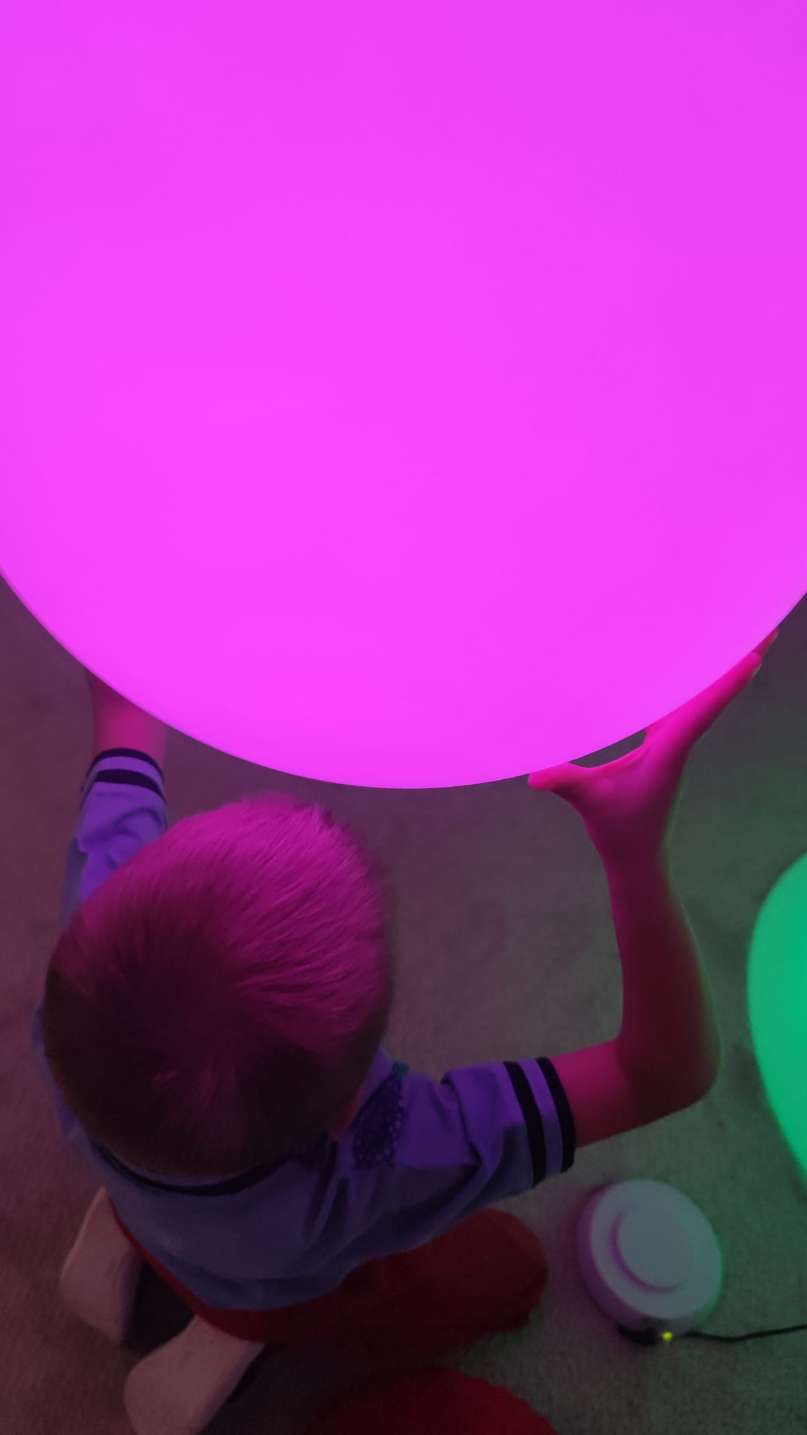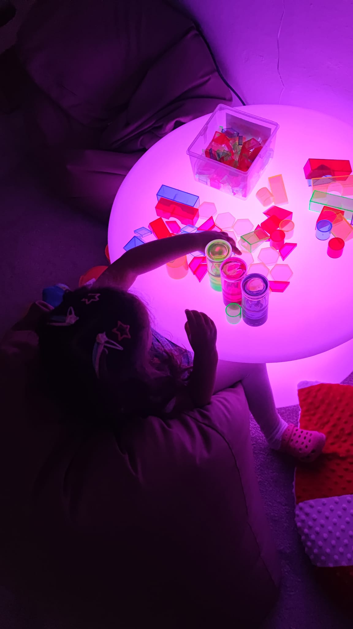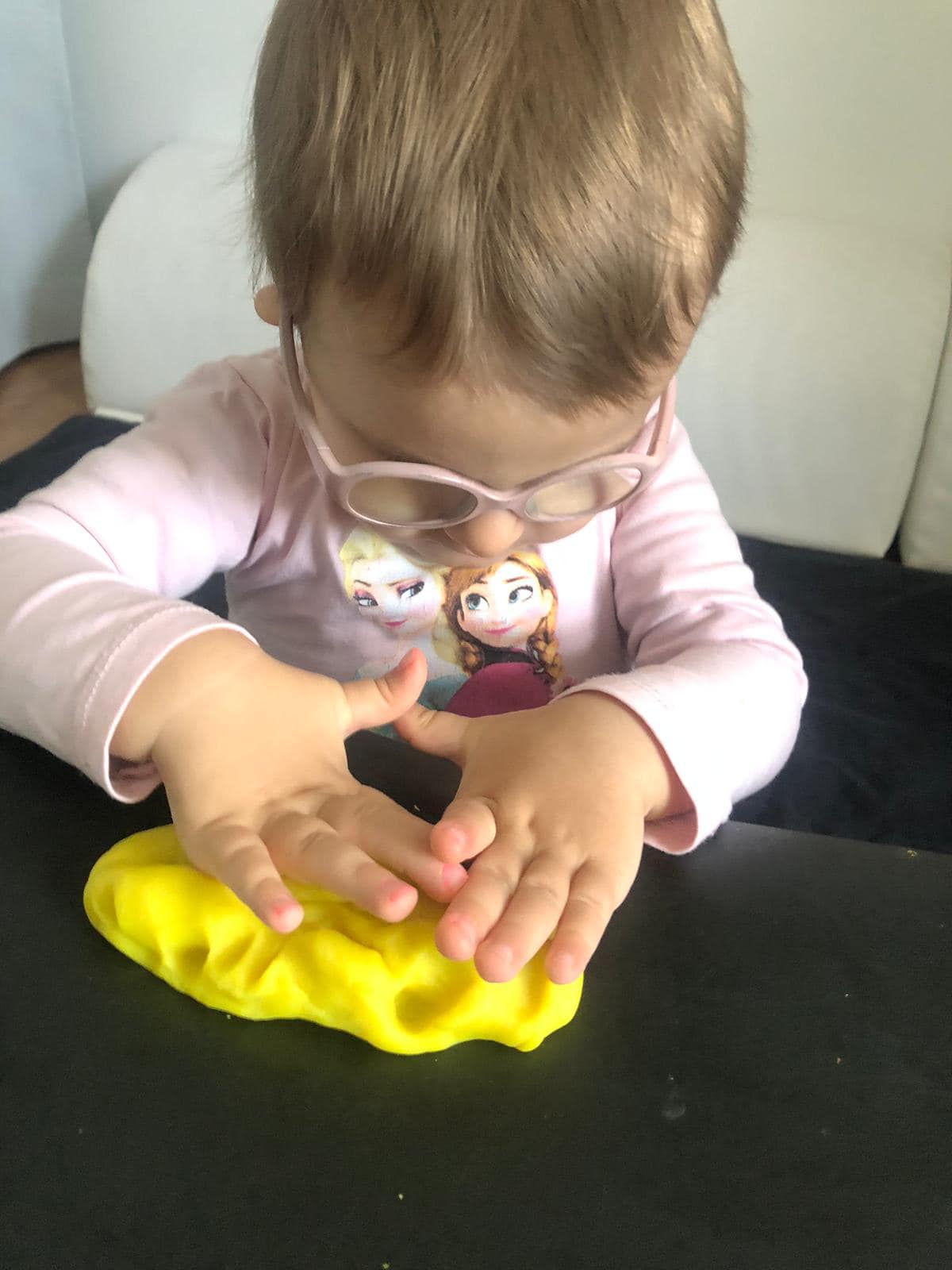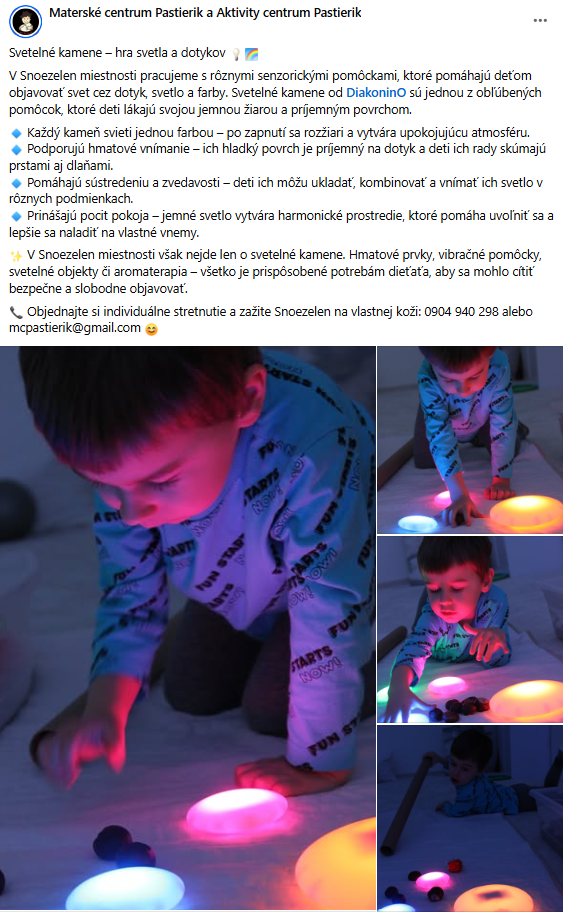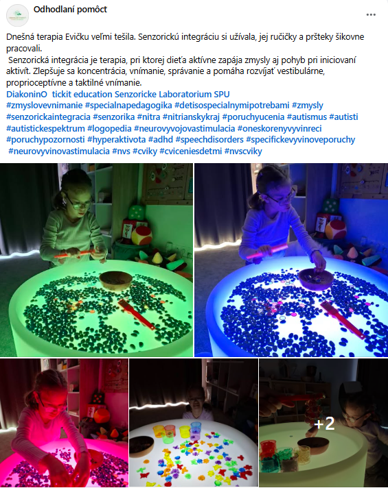 "Špeciálno-pedagogická intervencia zameraná na zrakovú stimuláciu, prepojenie ruka-oko. Anička sa čoraz viac odvažuje chytať aj nové materiály - farby, či pastelinu, o ktoré predtým nemala záujem. Za kúpu krásnych svetelných pomôcok z DiakoninO ďakujeme OZ Život bez hraníc."