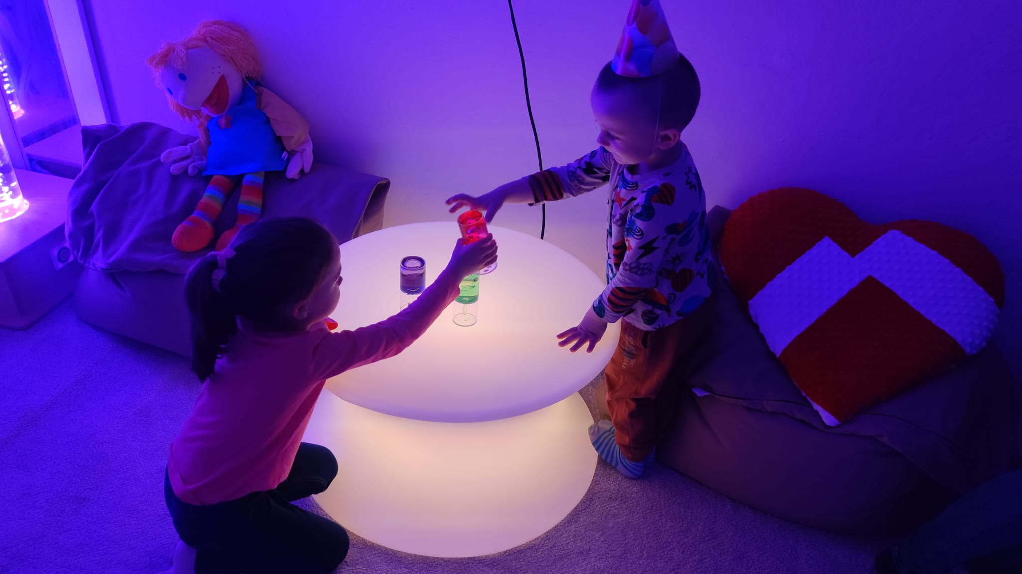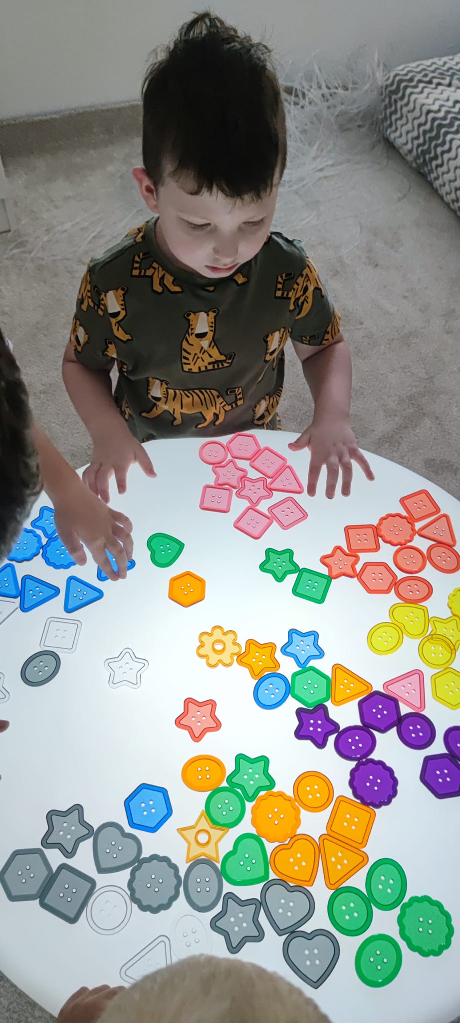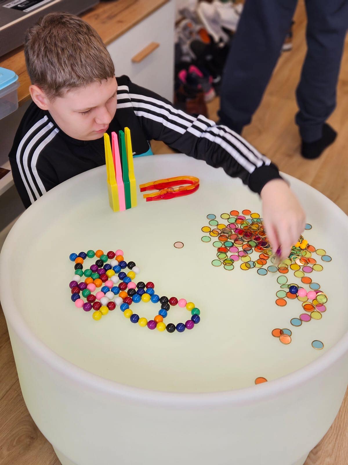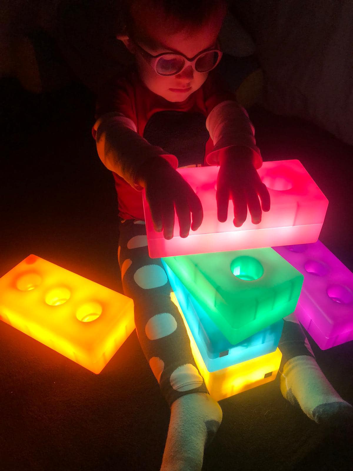 "Špeciálno-pedagogická intervencia zameraná na zrakovú stimuláciu, prepojenie ruka-oko. Anička sa čoraz viac odvažuje chytať aj nové materiály - farby, či pastelinu, o ktoré predtým nemala záujem. Za kúpu krásnych svetelných pomôcok z DiakoninO ďakujeme OZ Život bez hraníc."