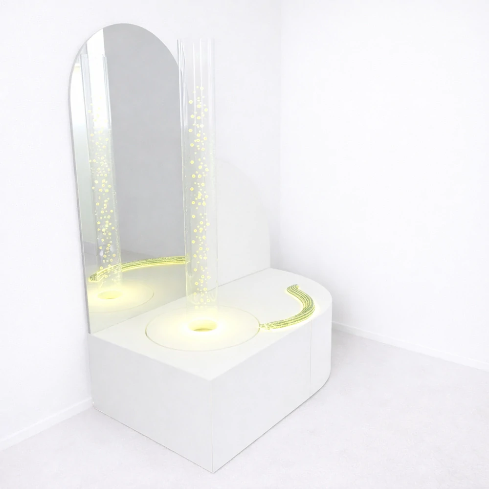 Nástenný modul Rohové sedenie vytvára útulný priestor na sedenie s optickými vláknami a bublinkovým valcom.