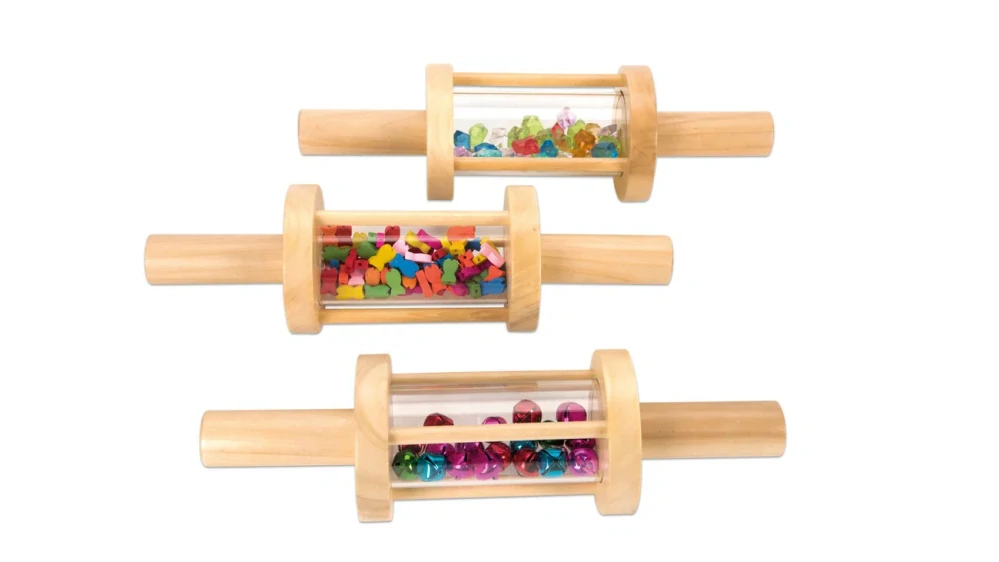 Sada drevených senzorických valčekov s farebnými prvkami vo vnútri, ako sú zvončeky, drevené korálky a kryštáliky, ktoré pri pohybe vydávajú rôzne zvuky. Valčeky stimulujú zmyslové vnímanie, podporujú zrakovú a sluchovú pozornosť a prirodzene motivujú deti k pohybu, skúmaniu a hre.