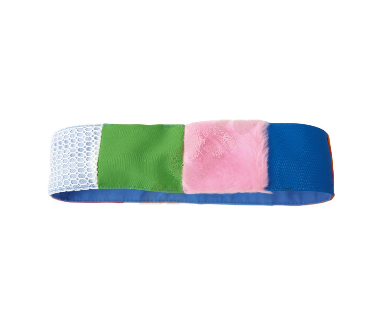 Šatka zošitá z malých kúskov materiálov s rôznymi povrchmi. Vnútri je všitá guľôčka na presúvanie.