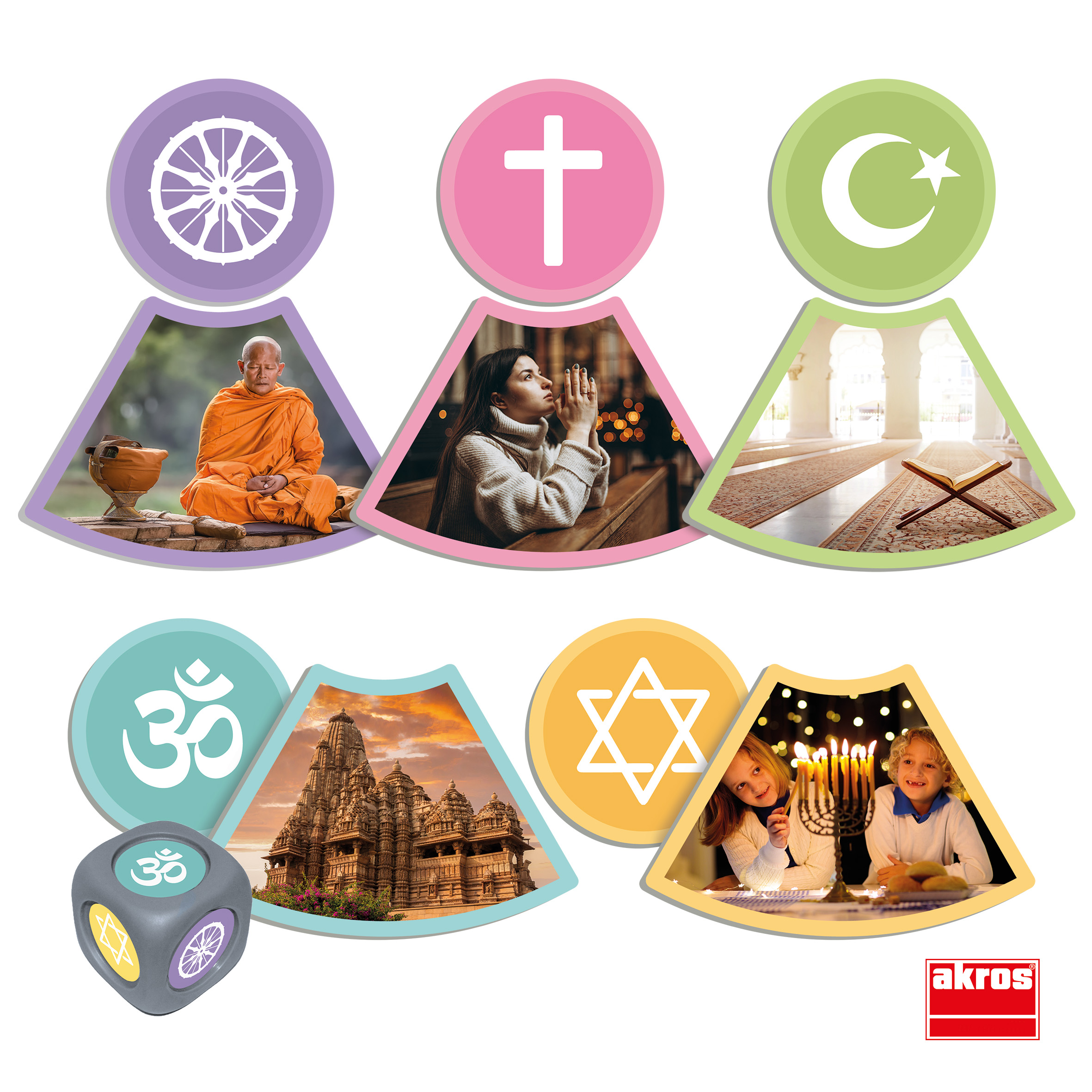 Priraďovacia hra s fotografiami na objavovanie a spoznávanie rôznych náboženstiev. Ponúka šancu rozvíjať vzdelanie založené na hodnotách ako základ pre riešenie konfliktov. Pomáha vám podporovať kultúru mieru a rešpektu už od útleho veku. Hra obsahuje nasledujúce náboženstvá: Budhizmus, Kresťanstvo, Hinduizmus, Islam a Judaizmus. Hoď kockou a dozvieš sa o nich všetko!