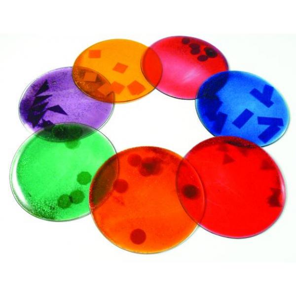 V každom farebnom kruhu sú malé 2D tvary na podporu skorého rozpoznania tvarov a farieb. Rovnako ako naše ostatné priehľadné produkty, aj táto sada je ideálna na použitie na svetelnom panely. Umiestnite kruhy na seba a uvidíte, ako presvitá svetlo. Tieto gélové kruhy nie sú vhodné na podlahu.